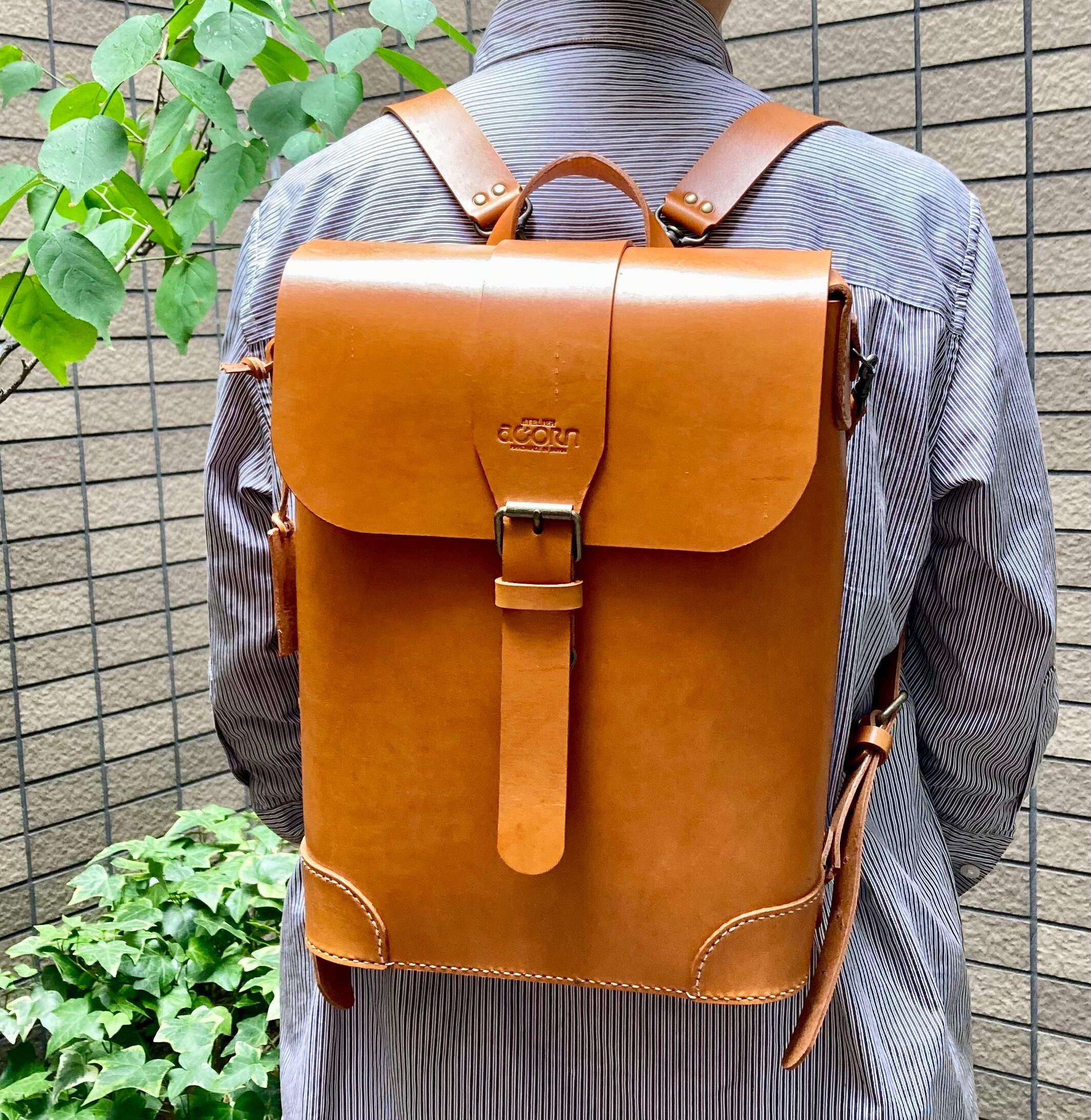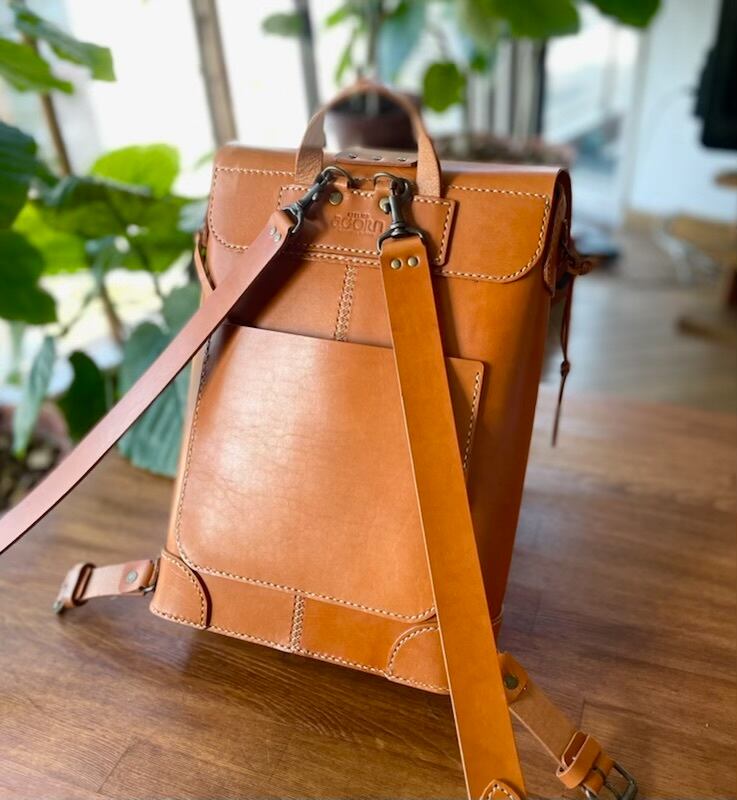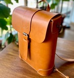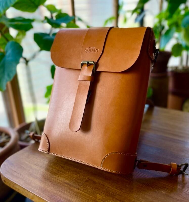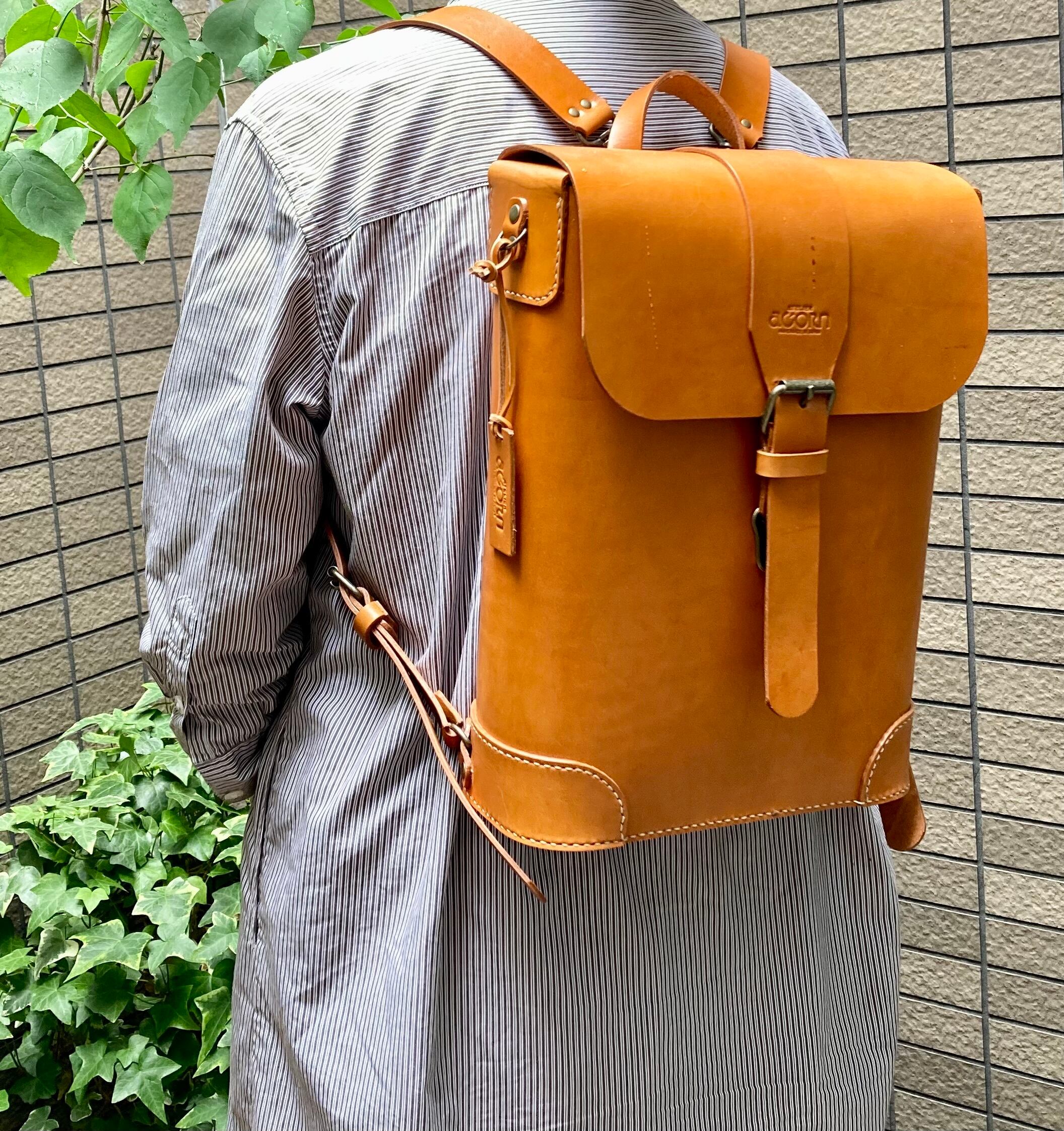 張りのあるヌメ革をぐるりと巻いて 手縫いで丹念に仕上げリュックです。