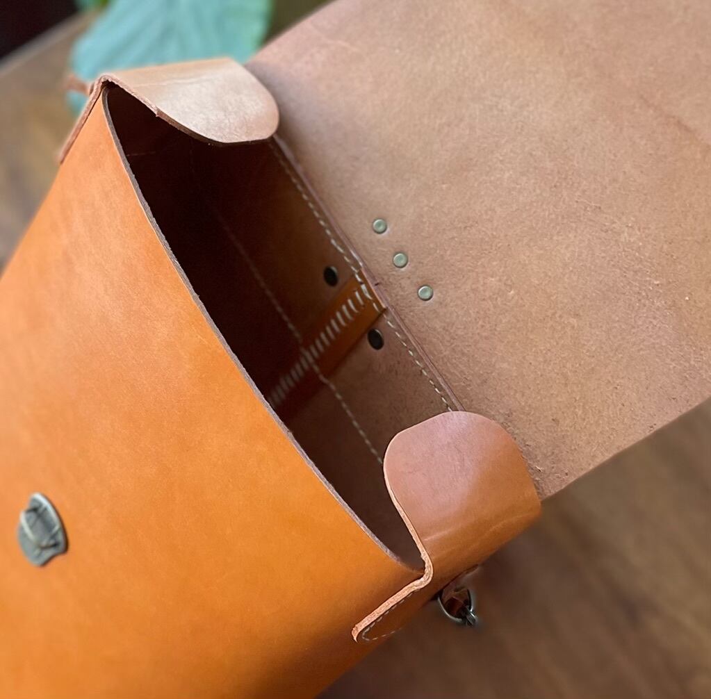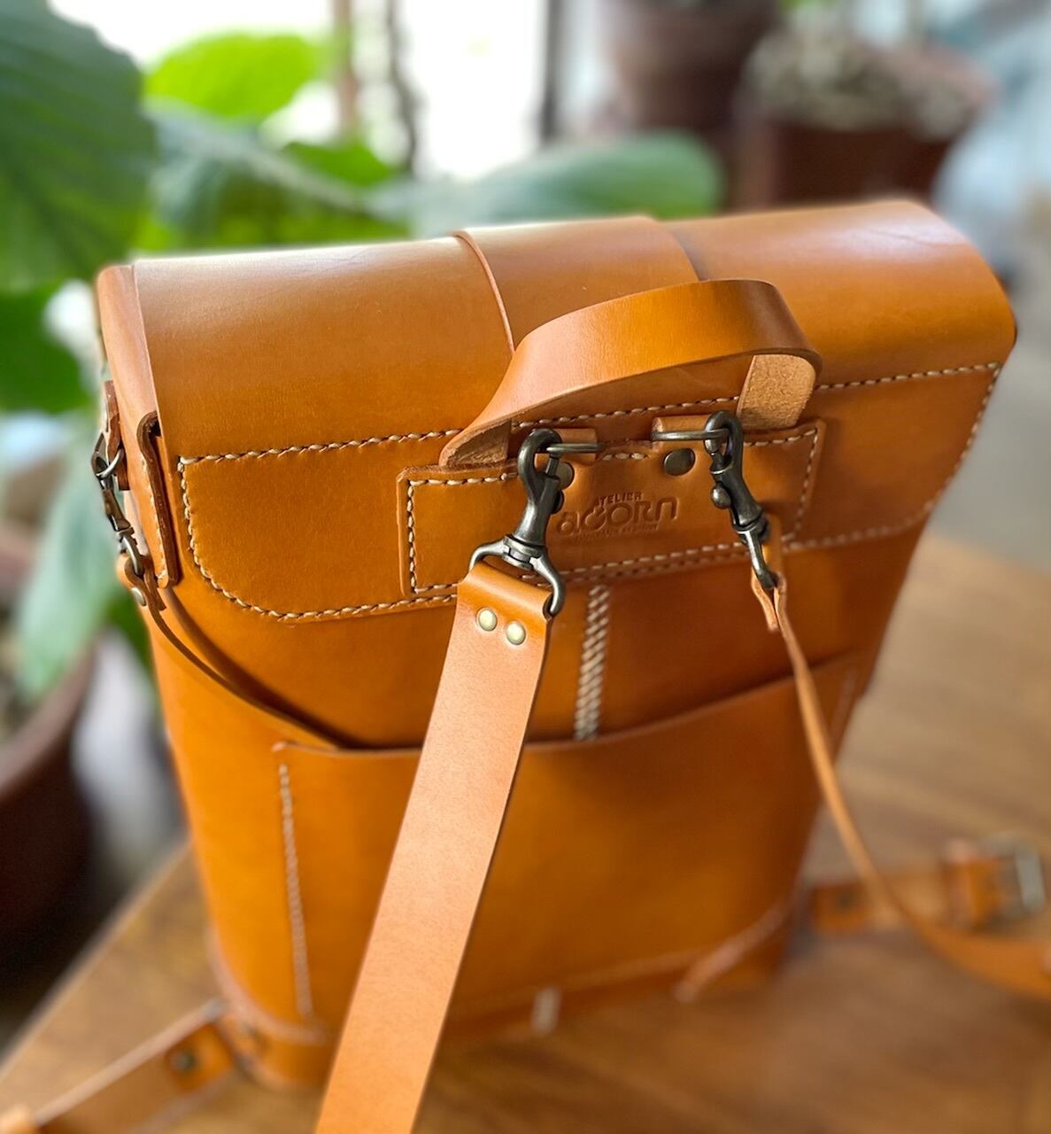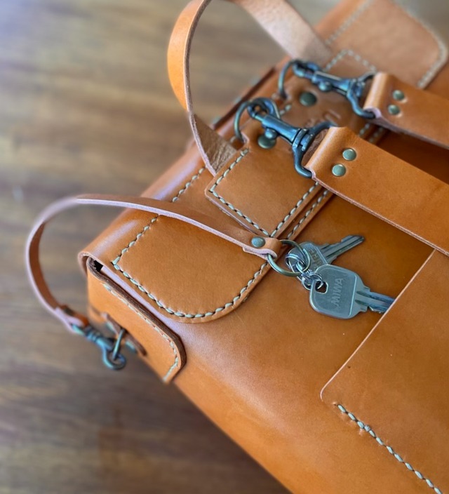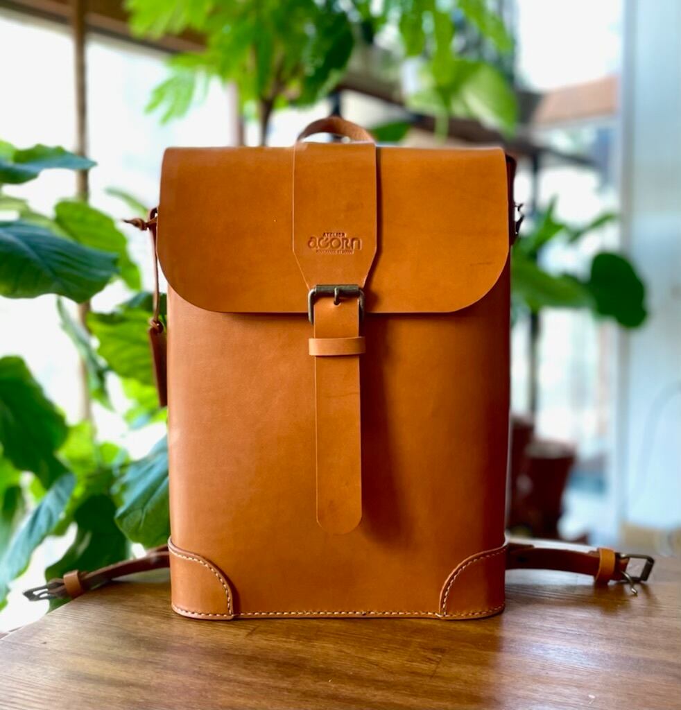 張りのあるヌメ革をぐるりと巻いて 手縫いで丹念に仕上げリュックです。