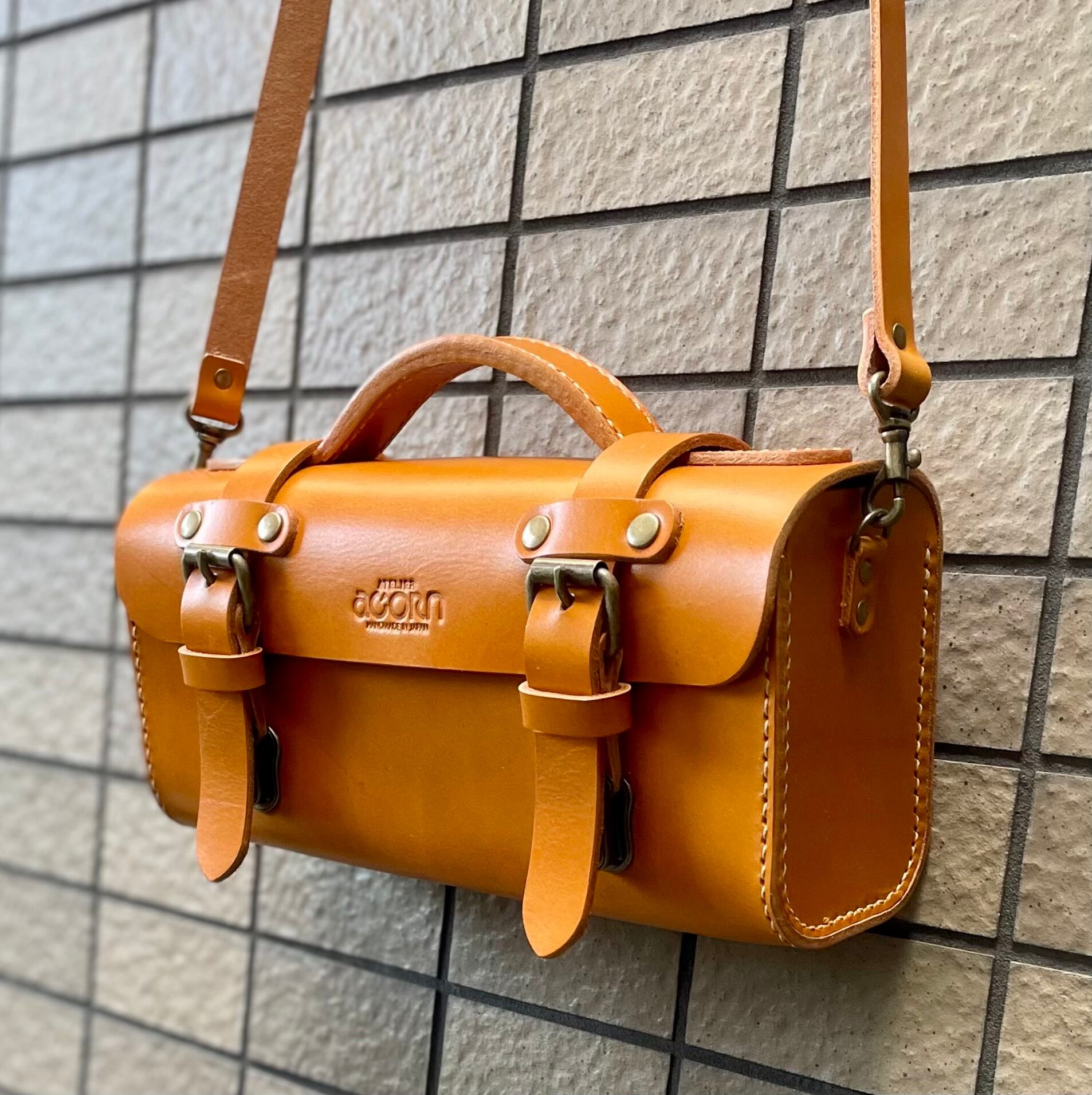 ヌメ革 ショルダーバッグ 横長 キャメル 手縫い ☆送料無料